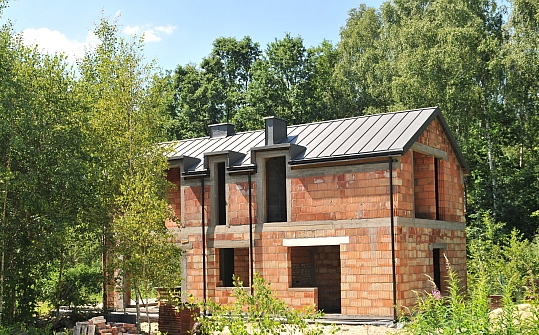 To etap budowy, w którym są już postawione ściany zewnętrzne, wewnętrzne, jest wykończony dach, wykonano otwory okienne. Nie ma jeszcze zamontowanej stolarki okiennej i drzwiowej.